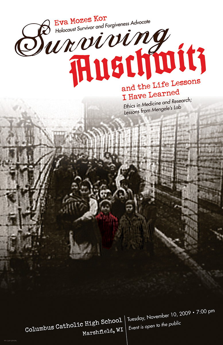 Poster for a program by Holocaust survivor Eva Moses Kor called "Surviving Auschwitz"